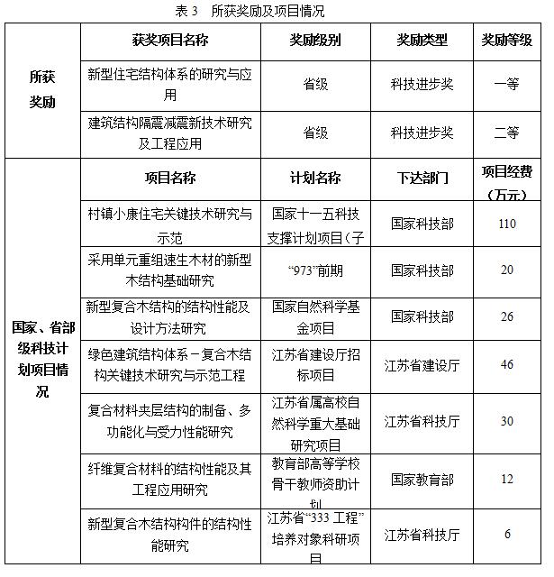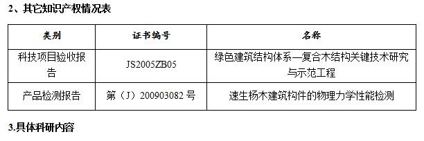 4) 与东南大学、南京林业大学、江苏省建筑科学研究院合作研究完成了“江苏省建设厅招标项目(JS2005ZB05)—绿色建筑结构体系—复合木结构关键技术研究与示范工程”。